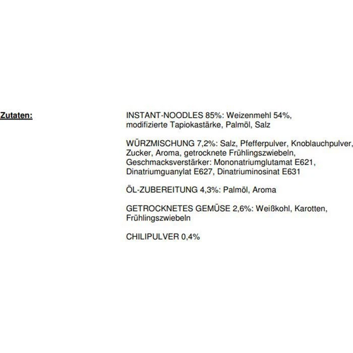 Zutaten: Instant-Noodles 85% – WEIZENMEHL 54%, modifizierte Tapiokastärke, Palmöl, Salz