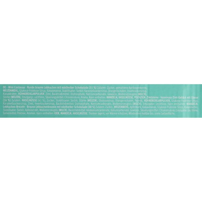 Zutaten: Mini Contessa – Zucker, gemahlene Aprikosenkerne, WEIZENMEHL, Glukose-Fruktose-Sirup, Kakaomasse, Stabilisator: Sorbit; Karamellzuckersirup, Orangenschalen, Invertzuckersirup, Kakaobutter, HÜHNEREIKLARPULVER, Zimt, Backtriebmittel: Diphosphate, Natriumcarbonate; Gewürze, Molkenerzeugnis (MILCH), Stärke (WEIZEN), Emulgator: Lecithine; Säuerungsmittel: Citronensäure; Aroma.