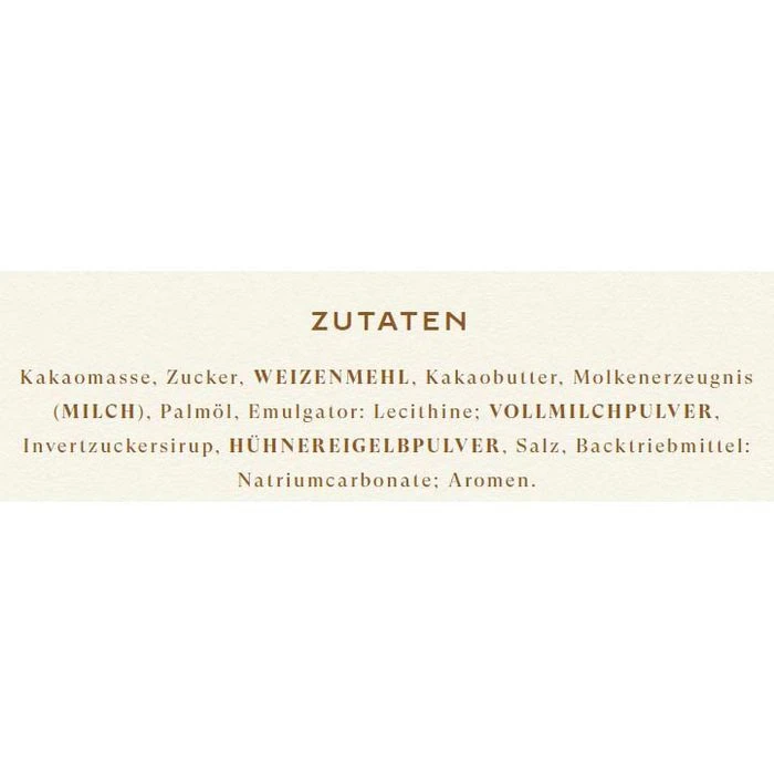 Zutaten: Kakaomasse, Zucker, WEIZENMEHL, Kakaobutter, Molkenerzeugnis (MILCH), Palmöl, Emulgator: Lecithine; VOLLMILCHPULVER, Invertzuckersirup, HÜHNEREIGELBPULVER, Salz, Backtriebmittel: Natriumcarbonate; Aromen.