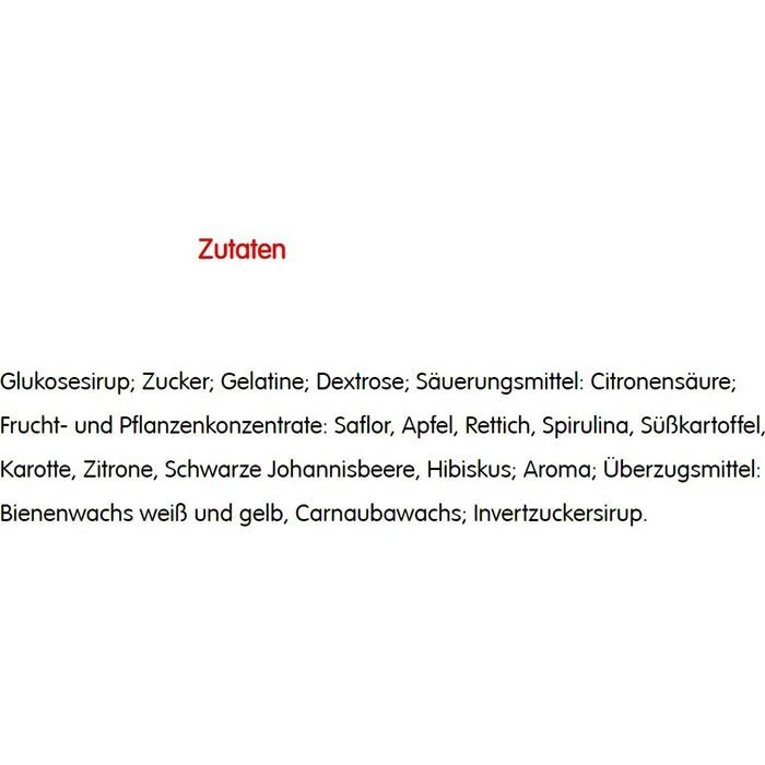 Zutaten: Glukosesirup, Zucker, Gelatine, Dextrose, Säuerungsmittel: Citronensäure, Frucht- und Pflanzenkonzentrate: Saflor, Apfel, Rettich, Spirulina, Süßkartoffel, Karotte, Zitrone, Schwarze Johannisbeere, Hibiskus, Aroma, Überzugsmittel: Bienenwachs weiß und gelb, Carnaubawachs, Invertzuckersirup