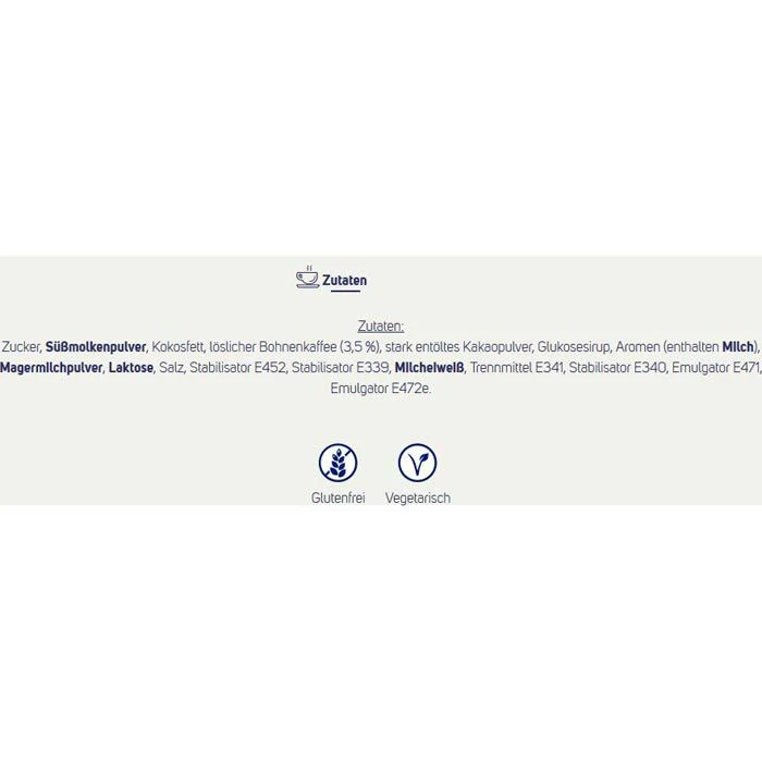 Zutaten: Zucker, SÜSSMOLKENPULVER, Kokosfett, löslicher Bohnenkaffee (3,5%), stark entöltes Kakaopulver, Glukosesirup, Aromen (enthalten MILCH), MAGERMILCHPULVER, LAKTOSE, Salz, Stabilisator E452, Stabilisator E339, MILCHEIWEISS, Trennmittel E341, Stabilisator E340, Emulgator E471, Emulgator E472e