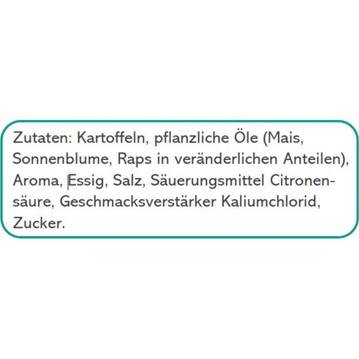 Zutaten: Kartoffeln, pflanzliche Öle (Mais, Sonnenblume, Raps in veränderlichen Anteilen), Aroma, Essig, Salz, Säuerungsmittel Citronensäure, Geschmacksverstärker Kaliumchlorid, Zucker.
