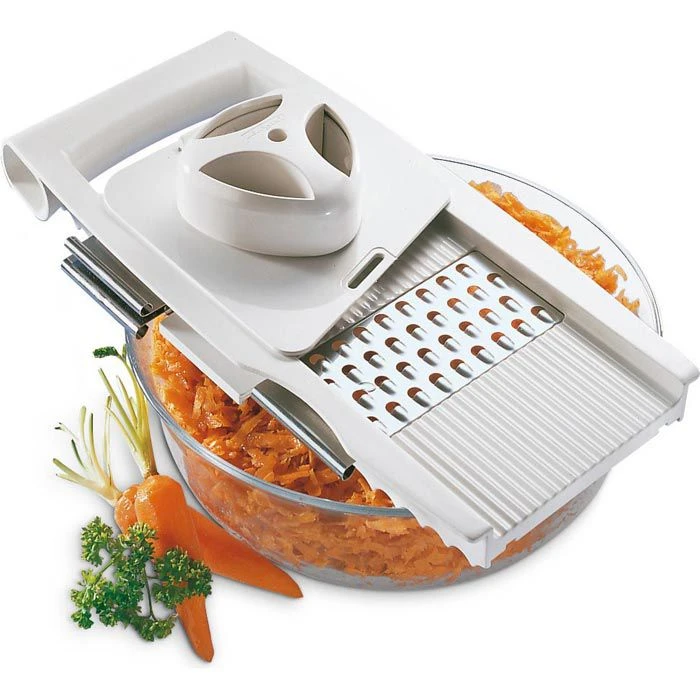 Klingenarten: 2-fach höhenverstellbare Allzweck-Schneideklinge, v-förmige Tomatenklinge, feine und grobe Gemüsereibe, Kartoffelreibe