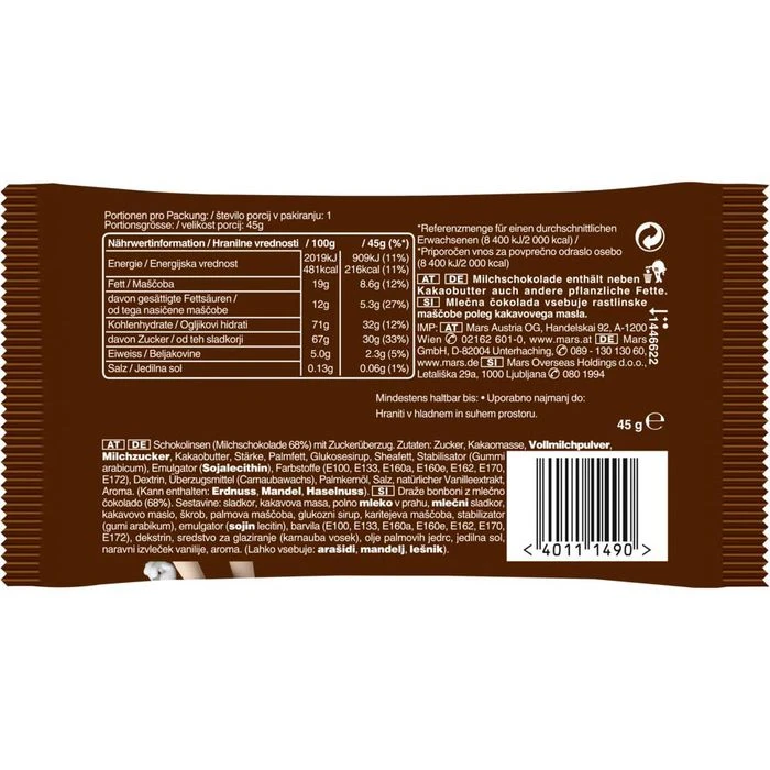Zutaten: Zucker, Kakaomasse, MAGERMILCHPULVER, MILCHZUCKER und MILCHEIWEISS, Kakaobutter, Butterreinfett (aus MILCH), Palmfett, Glukosesirup, Sheafett, Stärke, Emulgator (SOJALECITHIN), Farbstoffe (E100, E120, E133, E160a, E160e, E171), Dextrin, Überzugsmittel (Carnaubawachs), Aromen, Salz, Kokosnussöl