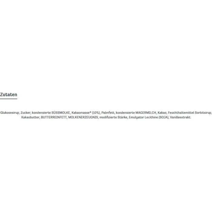 Glukosesirup, Zucker, kondensierte SÜSSMOLKE, Kakaomasse (10%), Palmfett, kondensierte MAGERMILCH, Kakao, Feuchthaltemittel Sorbitsirup, Kakaobutter, BUTTERREINFETT, MOLKENERZEUGNIS, modifizierte Stärke, Emulgator Lecithine (SOJA), Vanilleextrakt
