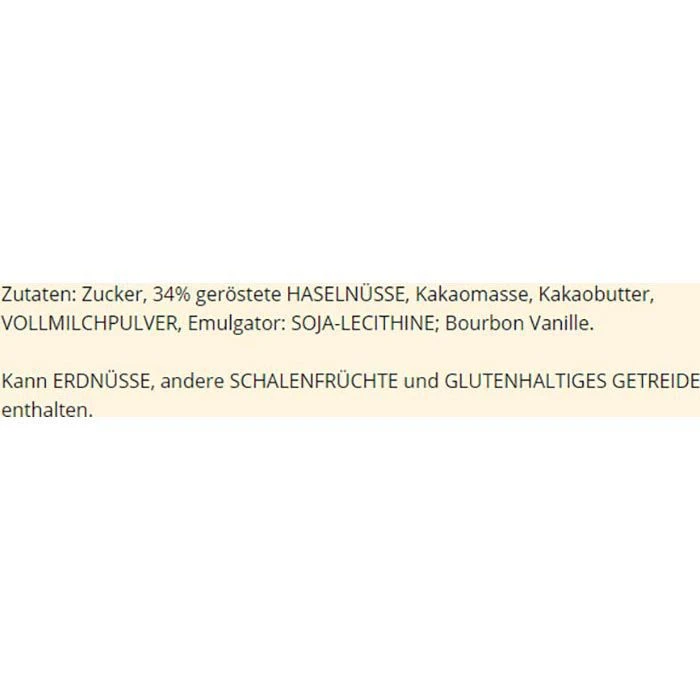Zutaten: Zucker, geröstete HASELNÜSSE (34%), Kakaomasse, Kakaobutter, VOLLMILCHPULVER, Emulgator: SOJALECITHINE; Bourbon Vanille